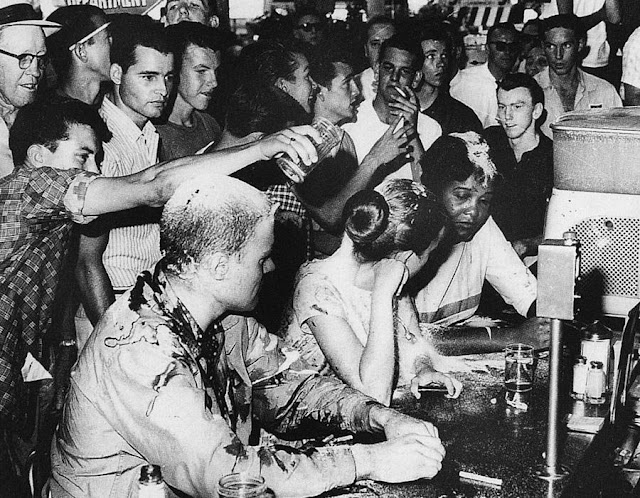 Lunch Counter Sit-In, Jackson Mississippi, 1963 Civil Rights demonstrators being taunted and covered with sugar, mustard and ketchup by idiots.